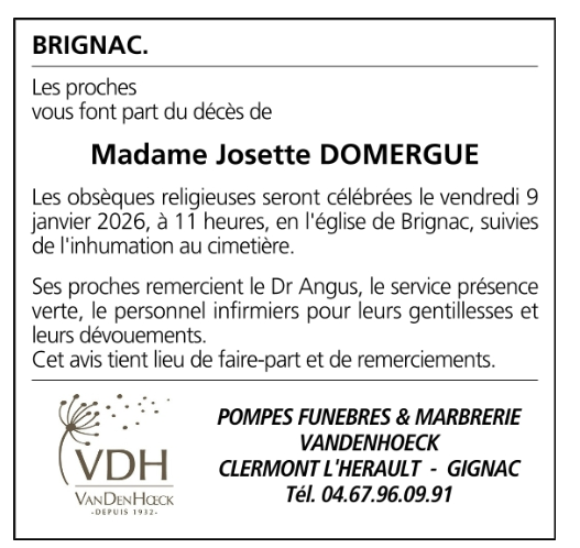 Décédée à Clermont-l'Hérault (34800, France) le mercredi 7 janvier 2026 à l'âge de 94 ans