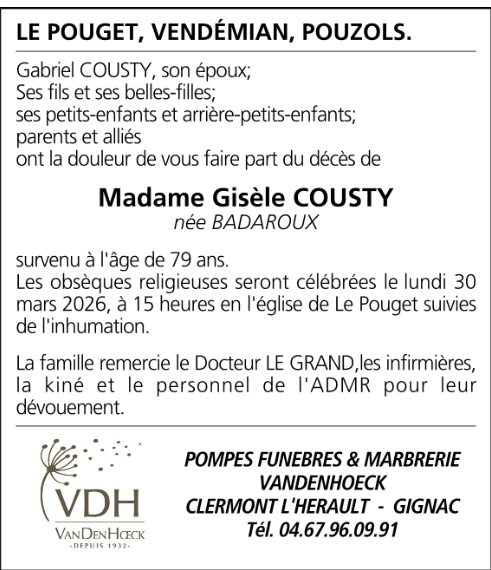 Décédée à Le Pouget (34230, France) le mercredi 25 mars 2026 à l'âge de 79 ans